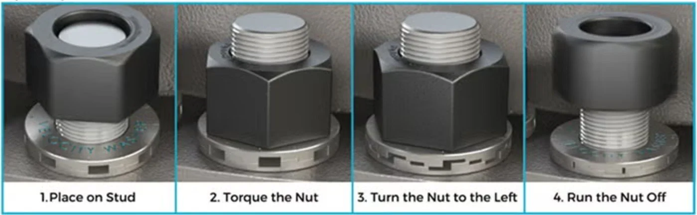 The magic is revealed when it's time to loosen the bolt. For breakout (disassembly), all you need to do is turn the nut about 12 degrees (only about one-third of a quarter-turn) to the left. After roughly this small fraction of a turn, the Velocity Washer’s internal mechanism will “pop” and release all the tension in the bolt. This audible pop indicates the bolt’s clamp load has been shed. At that point, the nut is no longer pressed tightly against the threads – it can be easily unscrewed by hand or with a standard wrench without any resistance. In practical terms, what might have taken hours before (or dangerous cutting) to undo now takes only a few seconds. The nut spins off freely, and the bolt can be removed without galling damage. Because the Velocity Washer doesn’t require any altered disassembly procedure beyond that initial small turn, workers adapt to it quickly – it’s a very simple “plug-and-play” solution for faster maintenance.